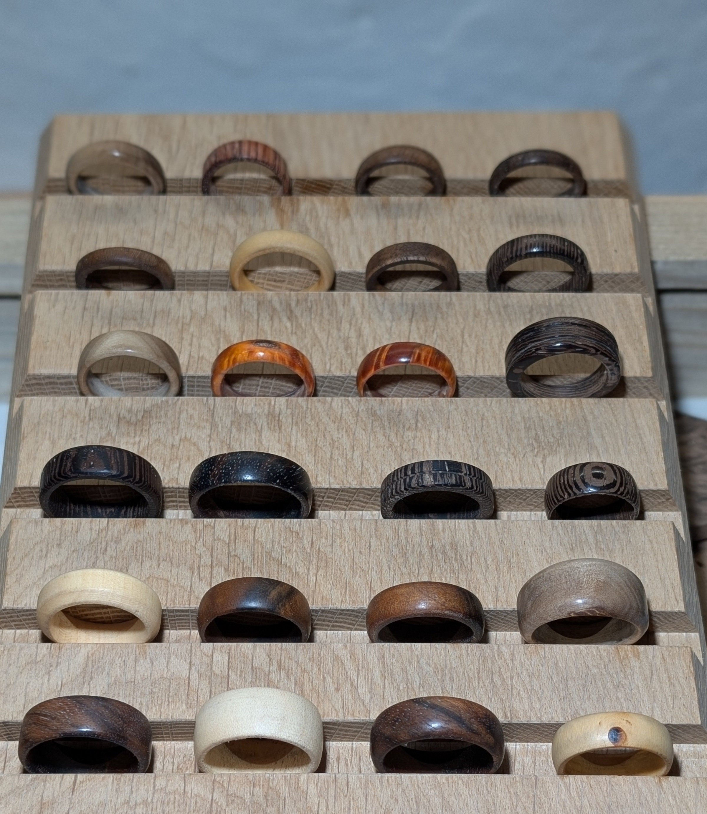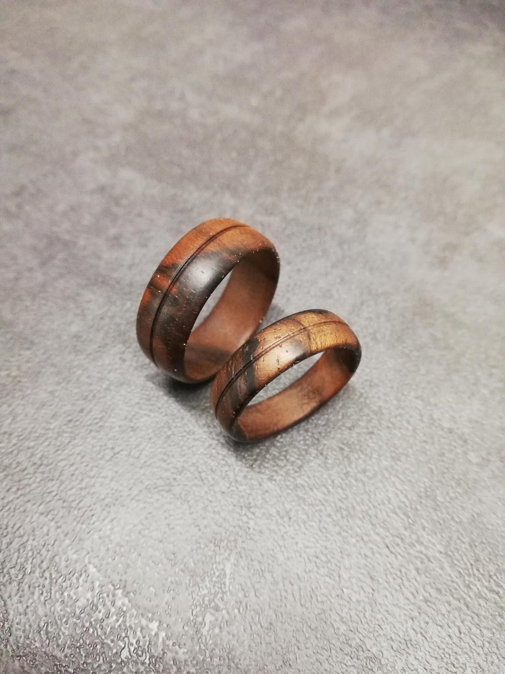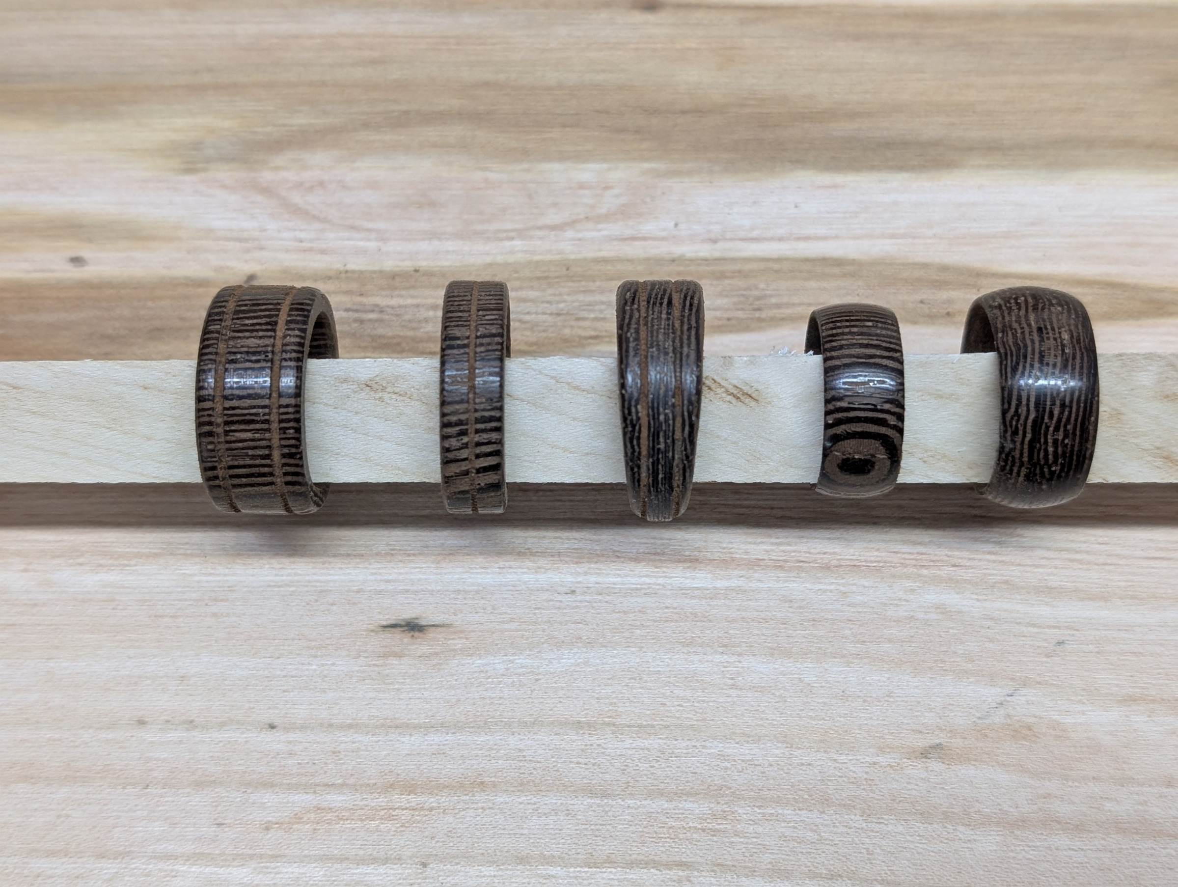 Aus den verschiedensten Hölzer wie z.b Olive, Walnuss, Wenge, Ahorn, Kirsche, Loorbeer usw. Durch die fertigung von allerlei Grössen und Formen bekommt jeder Ring seinen individuellen Charakter.