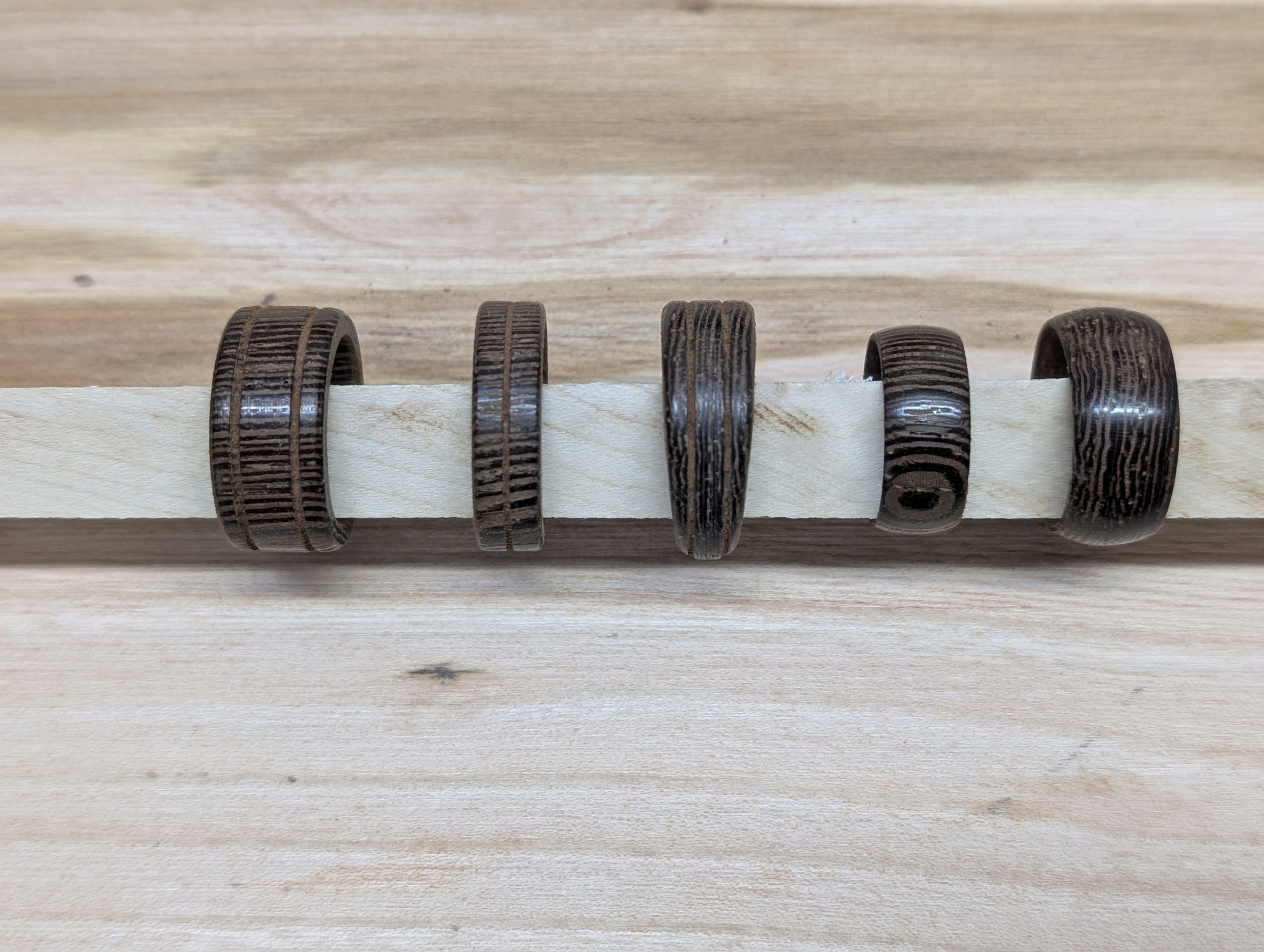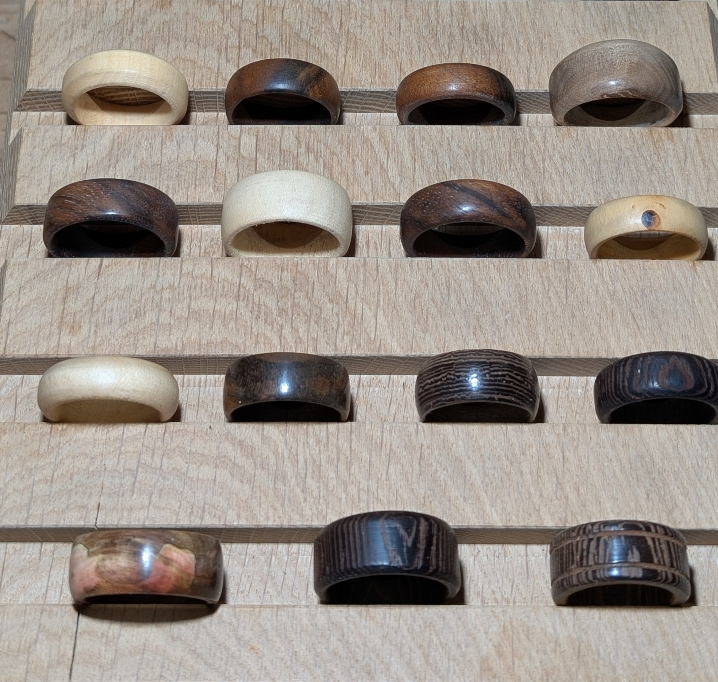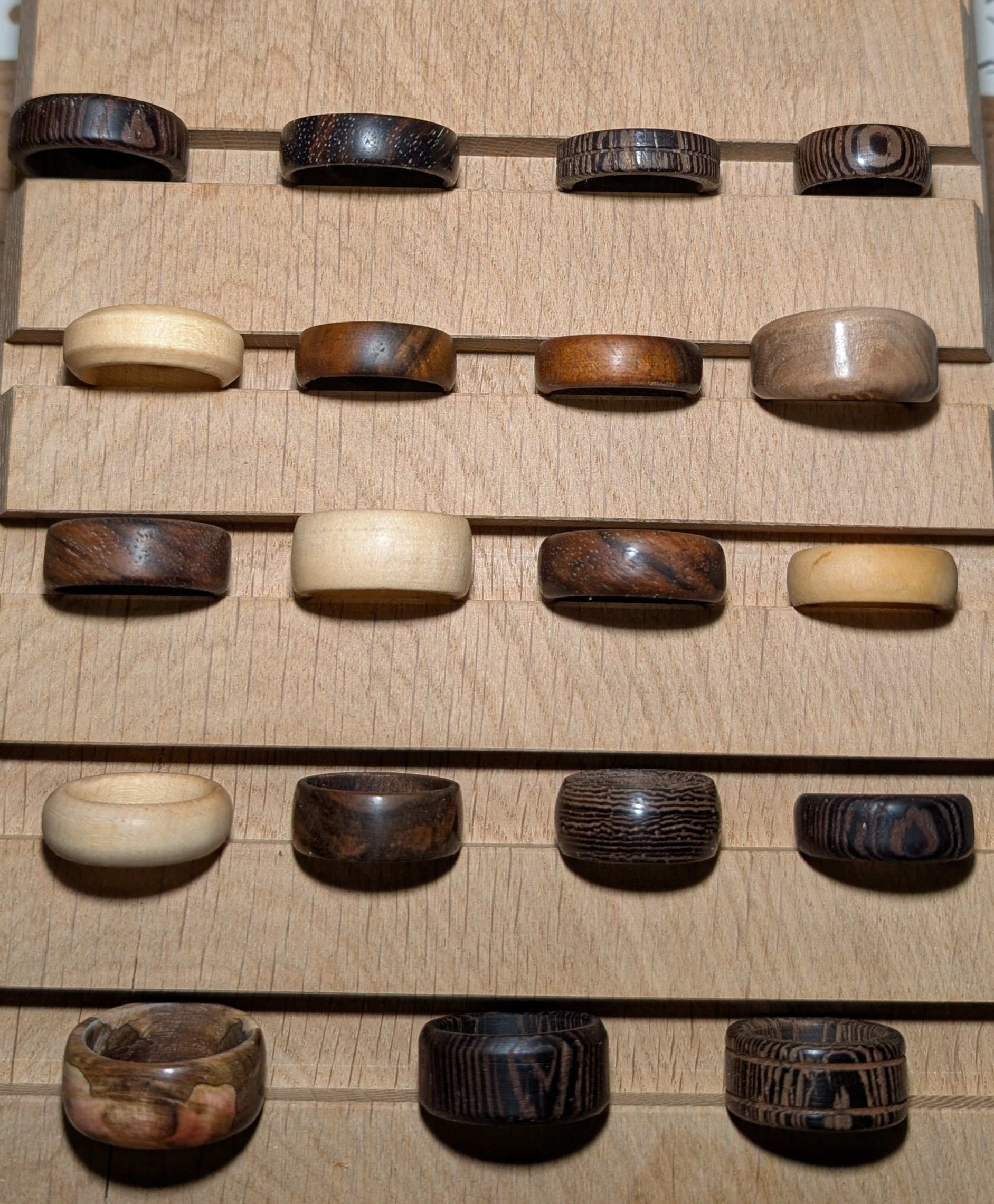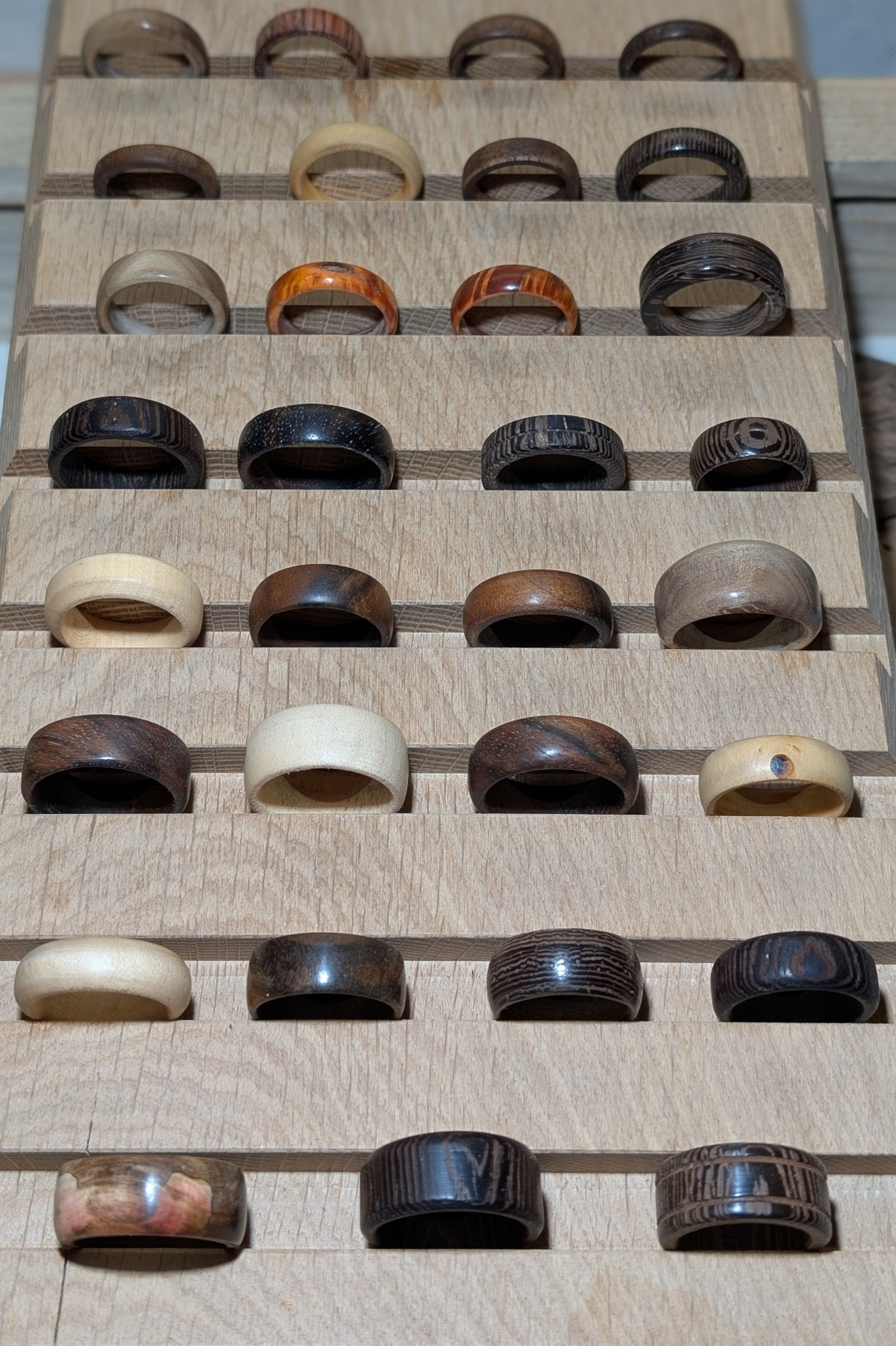 Aus den verschiedensten Hölzer wie z.b Olive, Walnuss, Wenge, Ahorn, Kirsche, Loorbeer usw. Durch die fertigung von allerlei Grössen und Formen bekommt jeder Ring seinen individuellen Charakter.